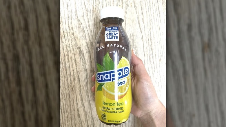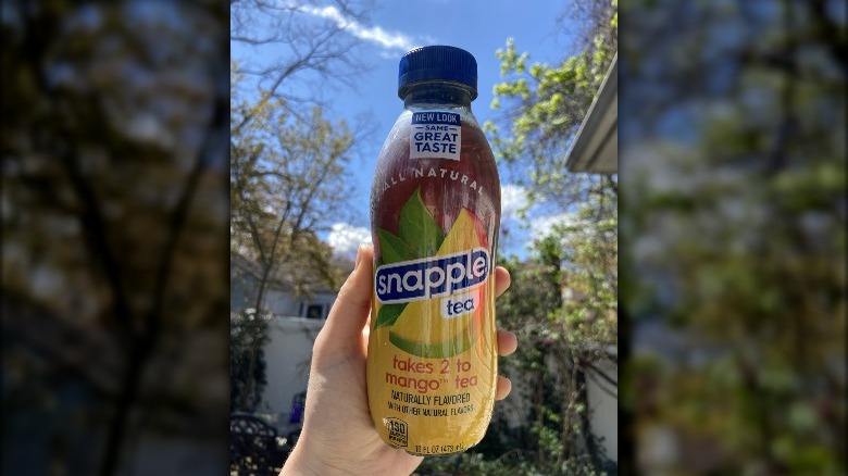 We tried 20 of Snapple's most popular flavors, which meant seeking more coveted flavors at a few different stores. Despite the array of shops we visited and flavors we tried, we somehow only came across one Snapple bottle that looked different than the rest. Most people will probably recognize that this bottle looks a lot more like the original Snapple drinks that used to be manufactured in glass bottles. A very with-the-times kind of company, Snapple has continually evolved as a brand to meet the needs of the ever-changing world in which we live, and one major change was the evolution of its bottle materials. According to the Snapple website, its newly plastic bottles are far more sustainable than its glass predecessors were.