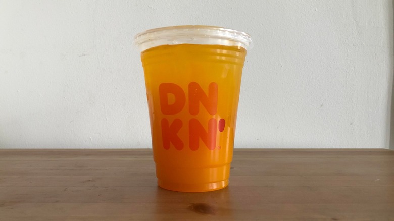 Can you tell that we're not into the Refreshers from Dunkin'? They're trying hard to be refreshing, but most of them are far from it. However, if you're looking for something that's slightly better than the other two we've already covered, then you may want to check out the Peach Passion Refresher. This one isn't good by any means, but it's definitely a step up. The peach flavor in this drink is strong — perhaps too strong. However, if you're really, really craving peach, you might be into it, despite the fact that it tastes more like artificial peach than the real thing. But what were you expecting from a fast-food drink?