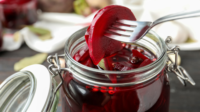 Canned beets are an easy alternative to fresh beets but boast a longer shelf life and are convenient to eat without the hassle of peeling and cooking. Nutrients aren't compromised either—canned beets are a good source of vitamins, nutrients (potassium, folate), and antioxidants as well as fiber (via WebMD). Because the liquid that beets are packed in also contains juices directly from the beets, there are benefits of keeping the beet brine.