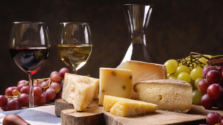 If you're a fan of red wine, it may be best to aim harder and sharper. According to cheese author Laura Werlin, via Real Simple, a wine as rich and full-bodied as a red needs a cheese that can match. An option like aged cheddar would work perfectly and continue to be a flavorful pairing throughout your entire glass.
