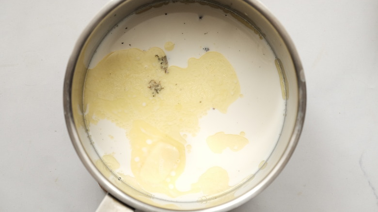 Pour the milk into a saucepan and add the butter, vanilla, and rum. If you'd prefer not to cook with alcohol, though, Ngo does note that "the rum is optional." He also notes that you can use either a vanilla bean or vanilla extract, although he himself prefers using the bean for better flavor.