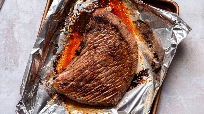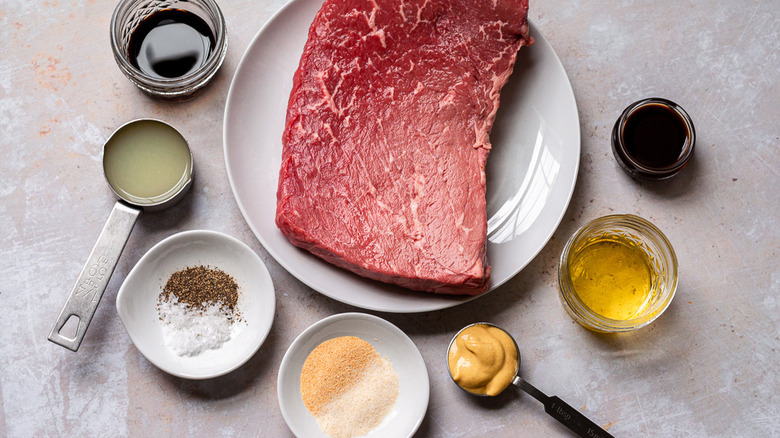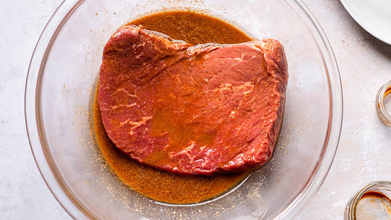 The second part of the recipe, however, involves a specific type of steak, that being London broil. As per the name, this is a cut that lends itself well to being broiled. Musgrave tells us that with such a steak, "Broiling is effective by giving the steak a crisp outside with a juicy interior." The last few steps, therefore, involve allowing the marinade to fulfill its intended purpose by using it to soak the steak and then following through on its promise by subsequently broiling said steak.