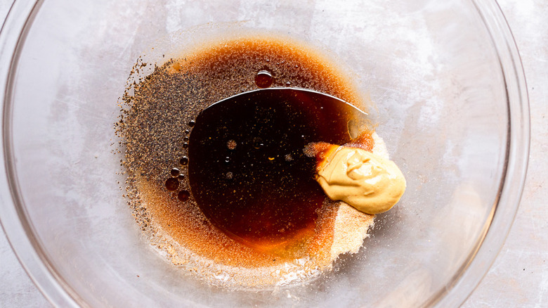 The first thing you'd better do, before you get started with the marinade, is to juice the lemon or lemons and measure out the appropriate amount of that ingredient. Mix it with the other liquids, these being the soy, oil, and Worcestershire sauce, then stir in the mustard and the seasonings.