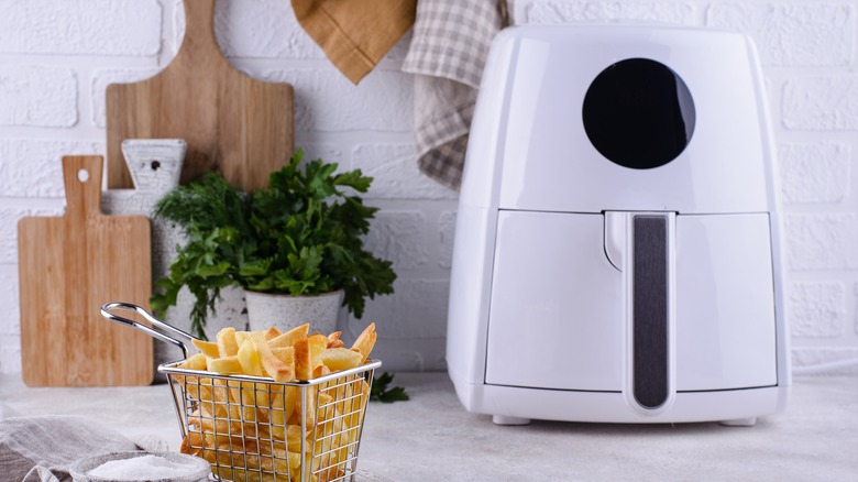 Food Network suggests that if you're craving crunch, try dipping your food in egg, flour, and breadcrumbs before air frying. This technique will add a crunchy exterior without the gooey, sticky mess. The Whole Portion suggests another crunchy option — dry-battering your foods in cornmeal or breadcrumb and avoiding the egg wash altogether. The site says it isn't difficult to prepare food in the air fryer as long as you don't use the wet, runny batter. Instead, the key is using a thick, dry coating that remains intact.