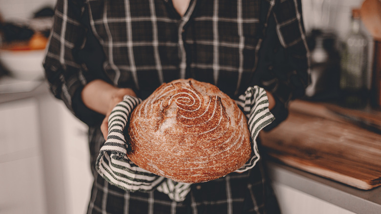 In addition to a gummy loaf, slicing too soon can also make the opposite happen and dry out your bread. Cutting into bread fresh out of the oven creates a massive hole through which steam can quickly escape. While that might be great for preventing a burnt mouth, your bread loses moisture when all that steam rushes out at once, per Food 52. Letting the steam seep out naturally, over a greater length of time (aka letting it cool down) helps you avoid ending up with a dry loaf tomorrow. When it has finally cooled, Epicurious recommends using a serrated knife with deep serrations to slice.
