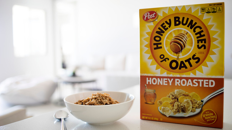 Honey Roasted Honey Bunches of Oats is easily recognizable. Post really hit the nail on the head with its product design. First of all, you have the honey dipper that's golden-brown and positively dripping with sweet ambrosia. That dipper is also in the center of a golden, shining sun with a beaming halo of light emanating from it. And there's a little honey pot below the sun, just in case you want more sweetness than is already on the wand. Yes, this cereal is very self-aware.