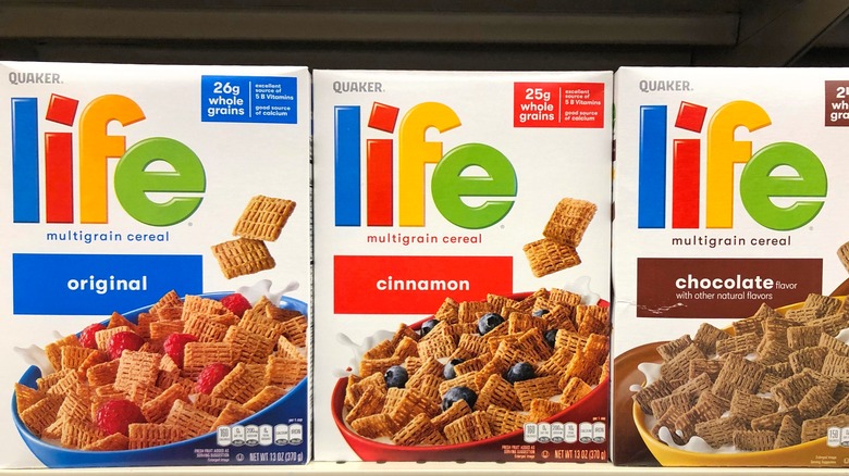 Speaking of Life ... there's a cereal that is literally called that! Life is another breakfast bowl that you probably didn't know is sold by Quaker. Life is a multigrain cereal that is is also sweet, simple, and somewhat delicate. You can enjoy this breakfast cereal vanilla-scented, powered by chocolate, jazzed up with cinnamon, or in its original form. Each little square has extremely fine interwoven strands of grain, leaving only the slightest hollow space within. If you threw in some blueberries, as suggested on the cinnamon box, you might crush them.