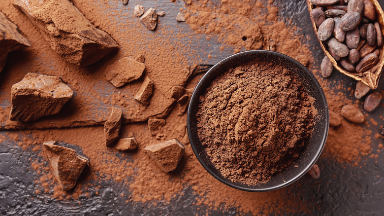 According to Serious Eats, cocoa powder is made using processed cacao beans. These are mostly sourced from West African countries along the equator like Ghana, Nigeria, and the Ivory Coast (via Statista). They are then fermented, dried, and roasted before being processed and separated into cocoa butter and cocoa solids. Those solids are finally turned into an easy-to-use natural cocoa powder for cooks to infuse recipes with pure chocolaty notes. The Dutch process version, however, involves another step. Dutched cocoa powder incorporates a potassium carbonate wash, which lowers the powder's acidity and creates a flavor that Serious Eats describes as "earthy, woodsy," and mellower than more acidic natural cocoa powder.
