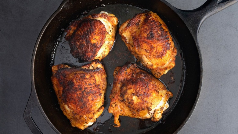 If your chicken is still sticking even after preheating the pan, bringing the chicken to a warmer temperature, and adding in a good amount of fat, there's a good chance there's another issue altogether. Food & Wine points out that food will often stick to cast iron when the pan is improperly seasoned or if there are leftover pieces of burned food stuck to the bottom. This often occurs after you've cooked something that contains sugar, so if your last dish included honey barbecue sauce or another sweet glaze, make sure to scrub your cast iron skillet well before you use it again.