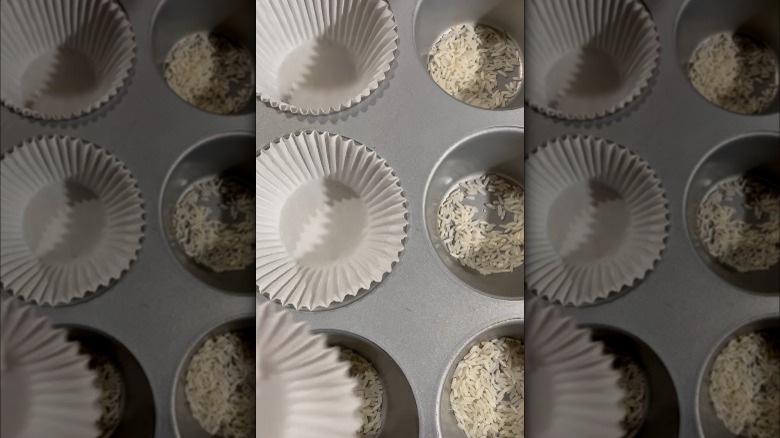 Per Maddox's explanation, the rice absorbs excess moisture and residual oil, creating a barrier between the batter and the pan. Ultimately, this results in perfect cupcake baking conditions. Just a teaspoon under each cupcake liner is all you need.