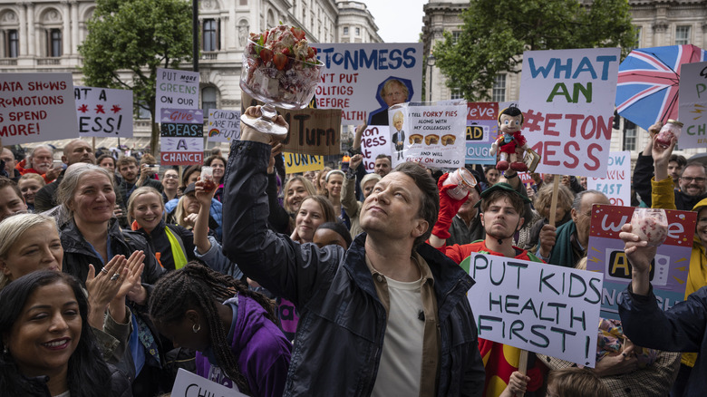 According to The Guardian, the U.K.'s government chose to break its promise to fight obesity just as the epidemic in children posts its highest annual spike in recorded history, and Jamie Oliver isn't having it. The famous chef rallied supporters to gather outside of 10 Downing Street with a sloppy, sweet British dessert made with meringue, fruit, and whipped cream called Eton Mess (per Atlas Obscura). To Oliver, the sweet treat symbolizes the political disarray in a government that seems to support the unhealthy foods and practices that can lead to obesity and other chronic diseases.