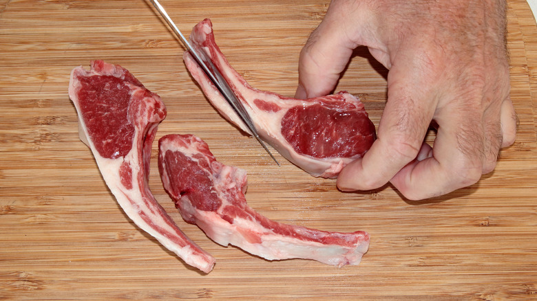 Australian Lamb recommends trimming the visible white fat from the outside of the cut of lamb, leaving only the intramuscular fat, which will lend flavor and juiciness to the final dish. If you want to make a rack of lamb less fatty, consider French-trimming it, which, according to Market House, calls for removing the extra layer of fat and meat from the bone of each chop. Delicious Magazine offers a step-by-step guide to make this super easy, and the result makes the chop far more elegant in appearance and keeps the cut from being too greasy.