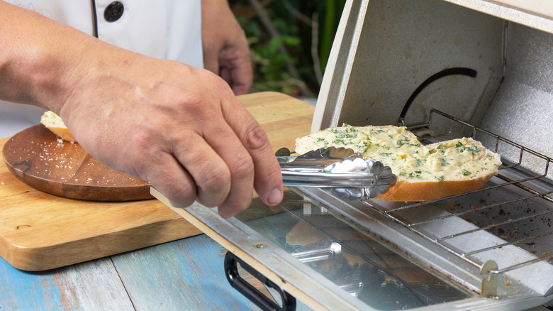 When working with a loaf or a piece of less-crusty bread, put it under the broiler for the last few minutes until it starts to brown, rather than just baking the bread uncovered. For even softer bread, the same principle applies, and CrunchyCreamySweet recommends spreading the bread with a butter-and-olive-oil combo to help the surface get crispy. Even if all you have is store-bought garlic bread, it's easy to ramp up the crispiness with the right oven settings — just let the butter melt first, then increase the heat.