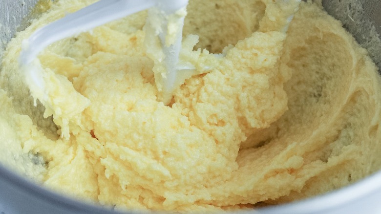 - Add the sugar and continue to cream the mixture on medium speed for 5 minutes, until it is light and fluffy. Stop once to scrape down the sides of the bowl with a spatula.