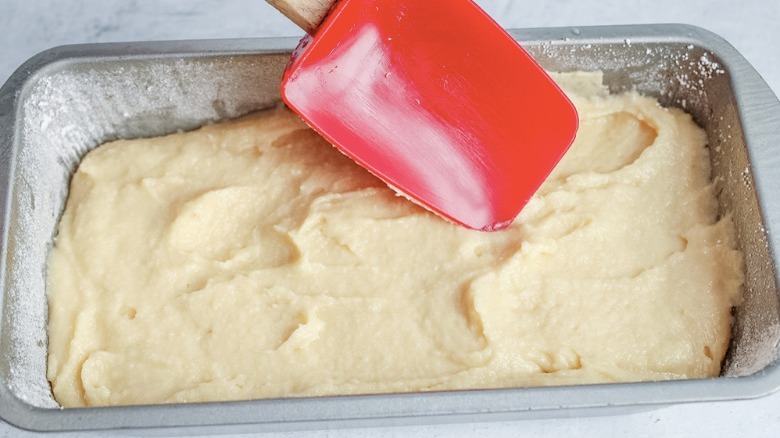 - Transfer the batter to the prepared loaf pan and smooth out the batter on the top. Bake in the preheated oven for 45 to 50 minutes, until the center is set and a toothpick inserted in the center comes out with just a few moist crumbs.
