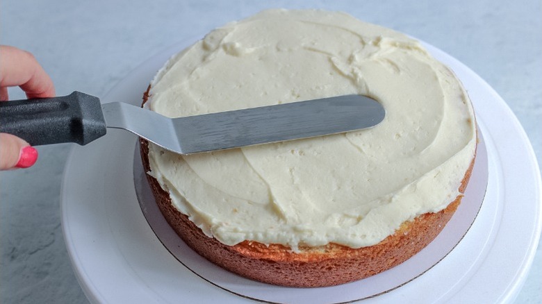 Once your cakes are cool, spread about ⅓ of the frosting on the top of one layer and place the second layer of cake on top. "For a layer cake you want to build the cake by adding a cake layer and then frosting it on top before adding the next layer so you get a stable cake," Morona says. Add the same amount of frosting to the top of the second layer, and then frost the sides.