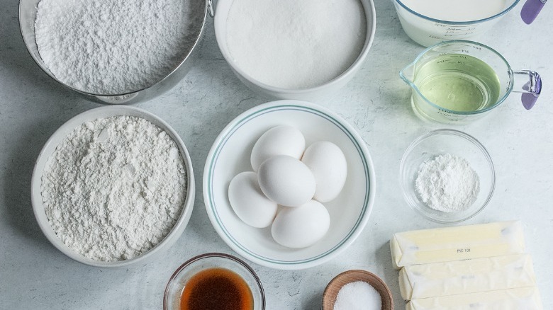 Don't be intimidated by the number of bowls in this photo; the ingredients you need to make this cake (and its frosting) are kitchen staples you probably have on hand already. You'll need several sticks of butter, the whites from five eggs (ideally room-temperature eggs), flour, baking powder, vanilla extract, powdered sugar and granulated sugar, whole milk, salt, and a neutral oil like canola or vegetable. You'll also need two 8-inch round cake pans, cooking spray, and some parchment paper.