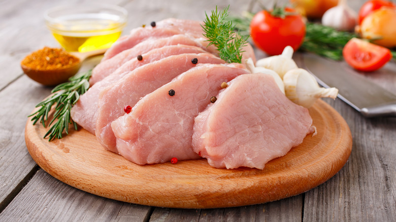 The pork chop is a cut of meat between an inch or an inch and a half thick, which usually comes from the loin (via The Kitchn). That's the section of the pig that runs from the shoulder to the hip along the animal's back. A butcher can take the shoulder, rib, loin, or sirloin chops from this section of meat. The Kitchn notes that each of these cuts has different properties, and will cook differently. A boneless pork chop is typically taken from a part of the loin chop or a rib chop that has had the bone removed. Both bone-in and boneless pork chops are fine options for anyone looking for a reliable piece of fairly lean meat, but both have their pros and cons as well.