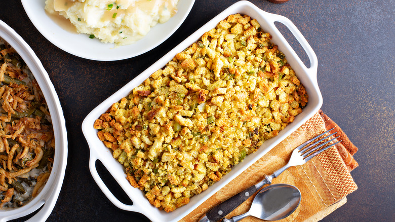 Stuffing is a staple at the Thanksgiving table. According to Newsweek, "stuffing" was the most searched side dish on Google during the week leading up to the holiday in 2021. Whether you prefer a traditional, homemade, a jazzed-up version like Tuscan bread stuffing, or just the boxed variety, the Thanksgiving dinner just wouldn't be the same without it.