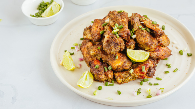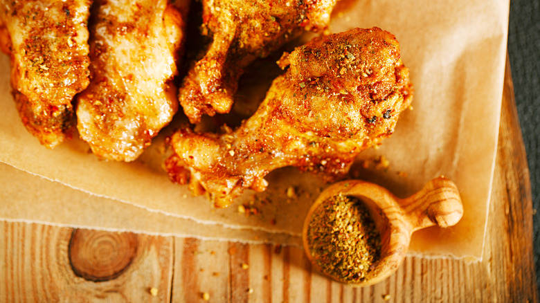 Dry rubs are a great option for chicken wings because they are easily customized and pack on tons of flavor. Bon Appétit notes that their two criteria for any dry rub are salt and brown sugar. From there, it just depends on what balance of flavors you want to add. You can use lemon pepper, Szechuan peppercorn, cumin, thyme, or any other dried herb you'd like in order to make it your own. The publication also noted that because dry rubs aren't adding any moisture to the surface of the meat, it creates a better environment for it to sear and caramelize (especially thanks to the added sugars).