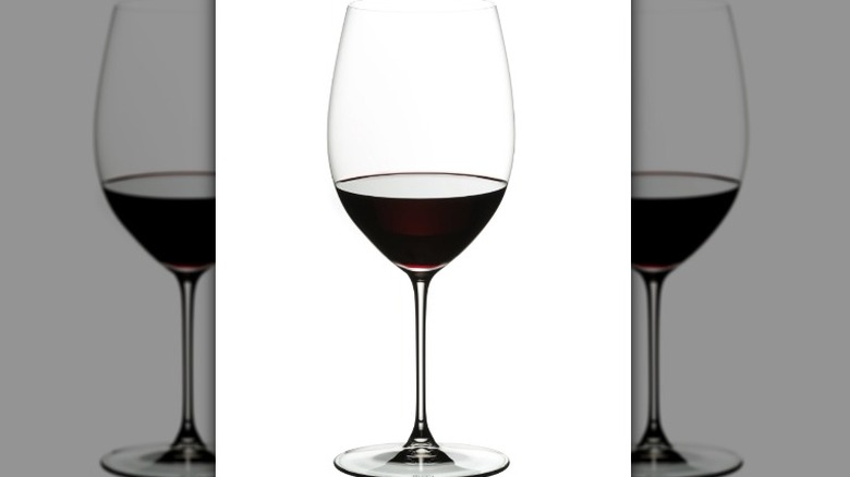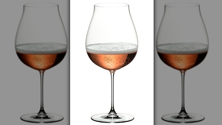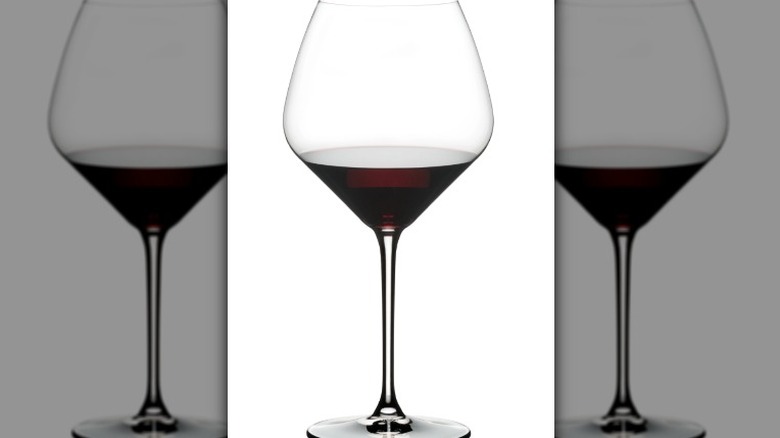 Shaped similarly to a broad teardrop, a pinot noir/Burgundy glass is wide with a tapered rim. Per information from glassmaker Riedel, this design puts a spotlight on fresh fruit aromas, as they are concentrated in the bowl before being channeled through the rim, which is relatively narrow compared to a cabernet sauvignon glass and wide versus a Bordeaux (via Usual Wines). Accordingly, the large surface area of the bowl allows more oxygen to reach the wine (via Wine Enthusiast).
