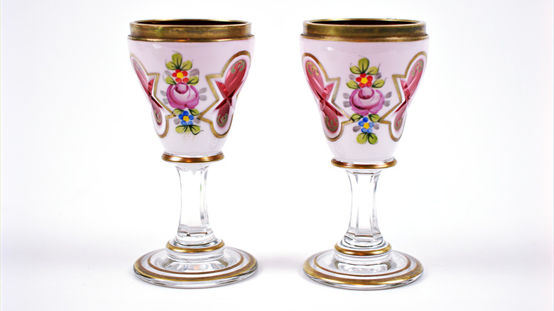 According to Leaf, hock is the term for German white wine. So, in a way, any glass made for white wine could be called a hock glass. Really, an actual hock glass is a stylish sipper that has been beautifully etched with ornate designs. At first, glassmakers created this glass style with a kaleidoscope of colors — and much bigger. Leaf writes that some hock glasses were close to ¼ liter in size. However, modern designs have made the hock smaller in size and clear crystal to show the wine's hue.