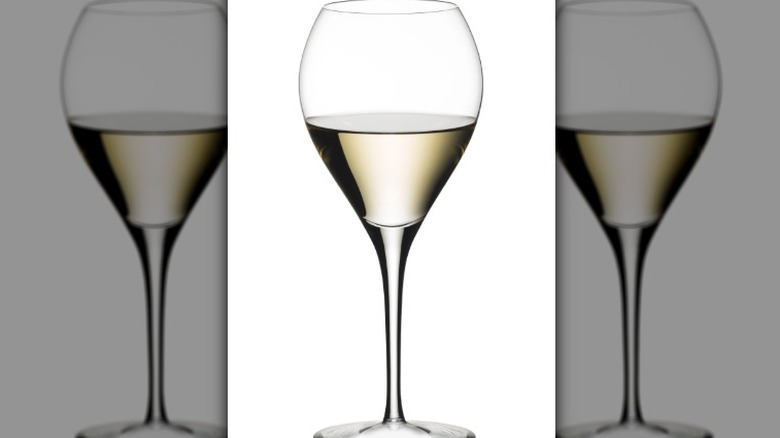 The design of a white Burgundy glass is similar to the red Burgundy glass but decreased in size and has a smaller stem. According to Business Insider, glasses designed for chardonnay should showcase a larger bowl, ideal for full-bodied white wines so as to utilize the expanded surface area. The volume and diameter make this design key for oak-aged chardonnay, viognier, petit manseng, and any other white wine with similar plush body or textural attributes. This type of glass is the perfect way for orange wine fans to accentuate such a layered and complex vino, per Wine Lover Magazine.