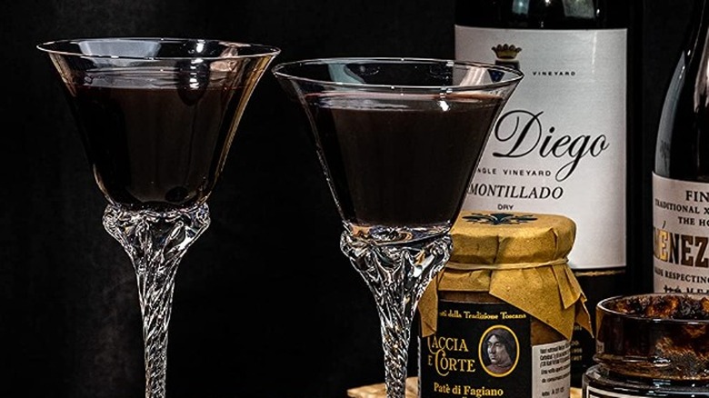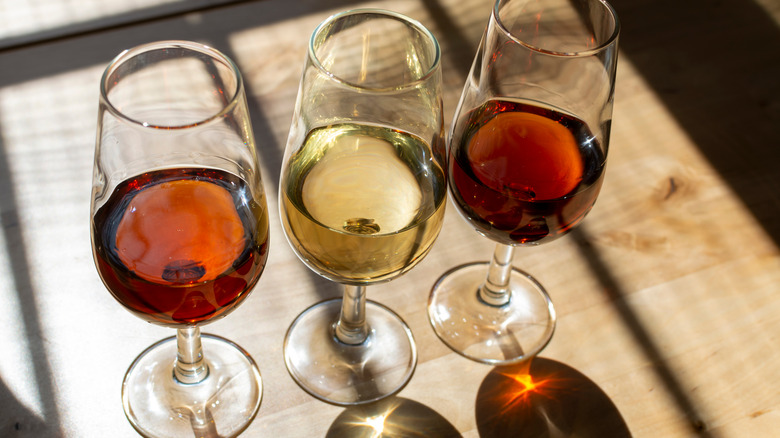 Sherry is a deeply complex wine from Spain made in three styles — dry sherry wines, naturally sweet wines, and sweet sherry wines (via Sherry Notes). Depending on if they are biologically aged or oxidatively aged, they can be nutty and brooding or refreshing with green apple notes. They go through an intricate barrel aging and blending system called solera. Similar to port wine, sherry is often consumed with dessert. Per Wazee Supper Club, the most suitable sherry glasses are similarly bulbous to allow for a marriage of aroma and taste.