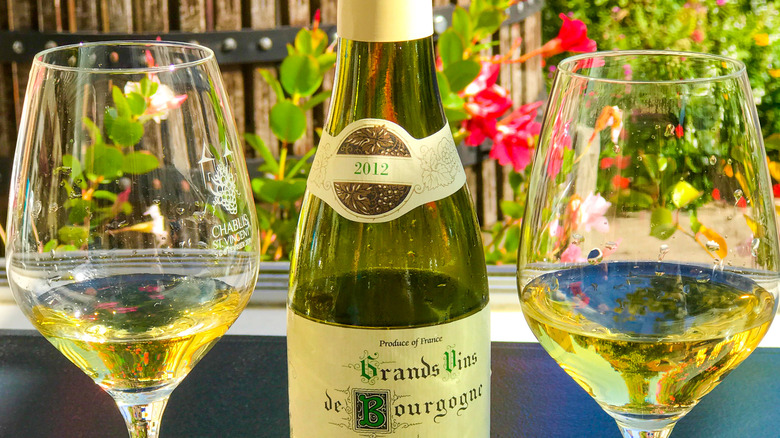 If you don't already have Riesling in it, pour some chardonnay into this glass goblet and allow the self-expression to bloom. Chablis is chardonnay grown in the Chablis region of France — which is in Burgundy (via Wine Folly). It is very different in style from a Napa Chardonnay. The Three Drinkers does a great job of explaining the differences. In Chablis, they typically do not use new oak, which adds those buttery, vanilla flavors found in many other American or French chardonnays.