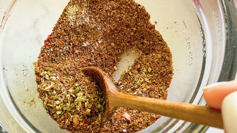 - Combine the chili powder, cumin, salt, pepper, smoked paprika, garlic granules, onion granules, red chili flakes, and oregano in a small jar or bowl.