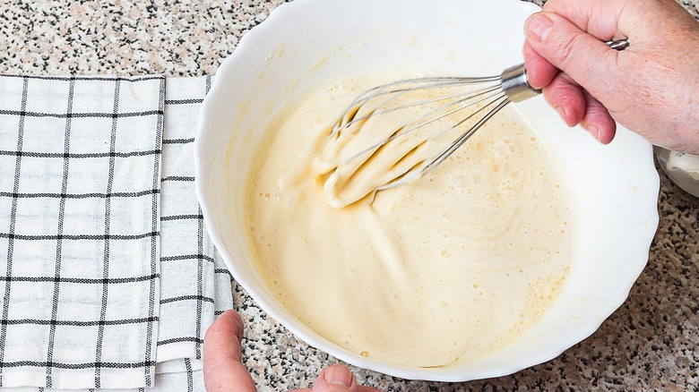 Pancake batter is also a good example of how whisking provides more control over the mixing process than an electric mixer, which runs the risk of over-mixing the batter and resulting in denser, chewier pancakes. And if you really want your pancakes to be extra fluffy, you can add mayonnaise — another ingredient commonly made with a whisk, incidentally — to your batter too. Of course, pancakes aren't the only breakfast foods that benefit from a good whisking: The tool is just as convenient in a recipe for buttermilk Belgian waffles.