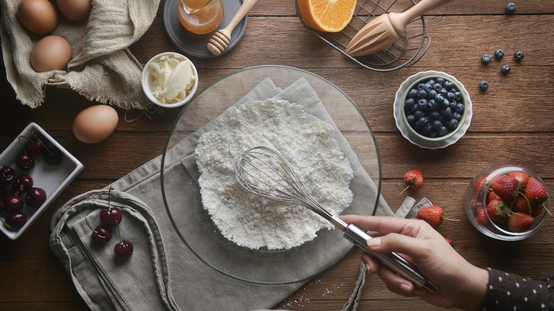 One of the most popular go-to uses for a whisk is mixing together dry ingredients for a pastry or dessert. When combining dry ingredients for a baking recipe, like flour, baking powder, baking soda, and salt, you can use a whisk in place of a sifter — in case you don't have a sifter on hand. Not only does it get the job done by evenly combining the dry ingredients by whisking them together in a bowl, but it also helps aerate everything in the same way that sifting would.