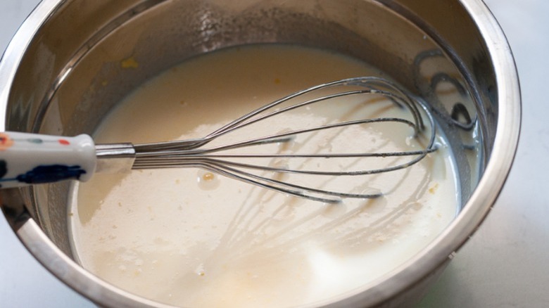 Let's get started. In a large bowl, add the pudding mix and whole milk. Whisk this combination well; after a while, it should begin to thicken. Ah, the magic of pudding mix! At this point, we're going to toss in a special ingredient: the vanilla extract. Musgrave says this ingredient is key, upping the vanilla factor and letting that floral aroma "stand out even more." Mix the vanilla extract in until it is thoroughly incorporated.