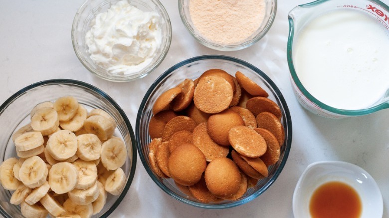 To make this classic banana pudding, let's start by gathering our ingredients. For this recipe, you will need instant vanilla pudding mix, whole milk, vanilla extract, bananas, vanilla wafer cookies, and whipped cream.