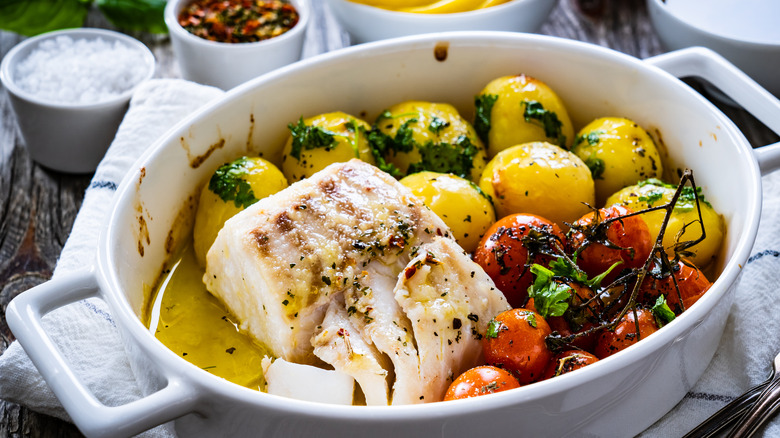 That's why you want to keep your lean fish hydrated by baking it in a shallow pool of liquid or sauce, such as wine, butter, milk, water, citrus juice, or any mixture of the former to your tastebuds' content (via Help With Cooking). Depending on how much fish you're making and the ingredients, you can get your fish Jacuzzi going in a braising dish, cookie sheet, or foil.