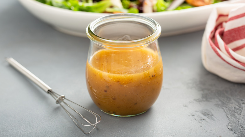 Fortunately for at-home salad makers, most vinaigrette dressings use a standard ratio, per Bon Appétit: three parts oil to one part vinegar. Truthfully though, this is just a baseline and can be adjusted to accommodate different ingredients, as well as personal tastes. This customizability offers endless possibilities to build off of, allowing you to recreate your favorite dressings or invent your own. Get creative and play around with different oils, throw in fresh herbs, or mix in seasonings (may we even suggest a little vanilla?) — there's a world of salad dressing out there, and you can soon be living in it.