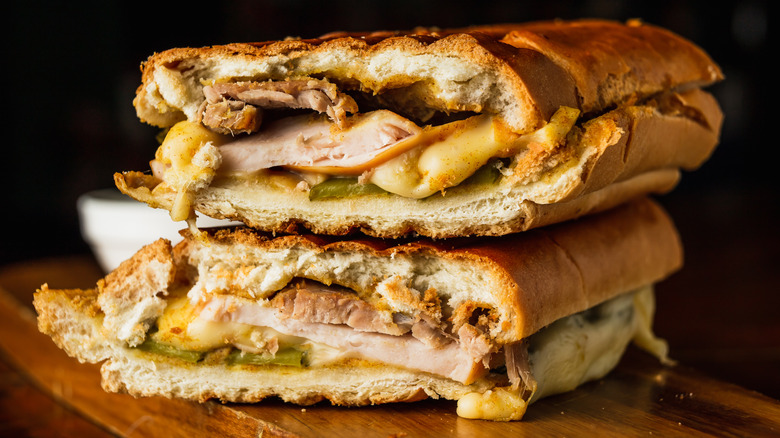 As with all great dishes, lots of different people, regions, and families have their own twists on the classic Cubano, including a recipe that has a variety of different spice combinations. No matter what spin the individual sandwich maker takes, Cubanos have certain key ingredients that are always included. They are seated on sweet Cuban bread, piled high with soft, juicy roasted pork and ham, lined with sour pickles and swiss cheese, and brought together with the warmest mustard and butter you can find, per Simply Recipes. Toast it all in a sandwich press, cut diagonally down the middle, and you've got one of the most iconic sandwiches this side of anywhere.