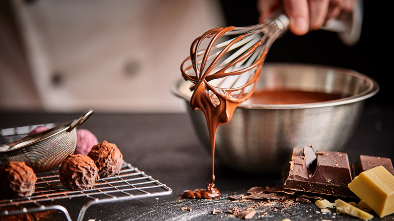 Kitchn says that chocolate is actually very dry — refining cocoa beans requires removing moisture, so adding any water to melted chocolate can seriously throw off the delicate balance by sticking to the dry components. If any water accidentally gets in your mix, they recommend turning it into a ganache or sauce — but if that wasn't the intention, it can be frustrating to have to change your game plan.