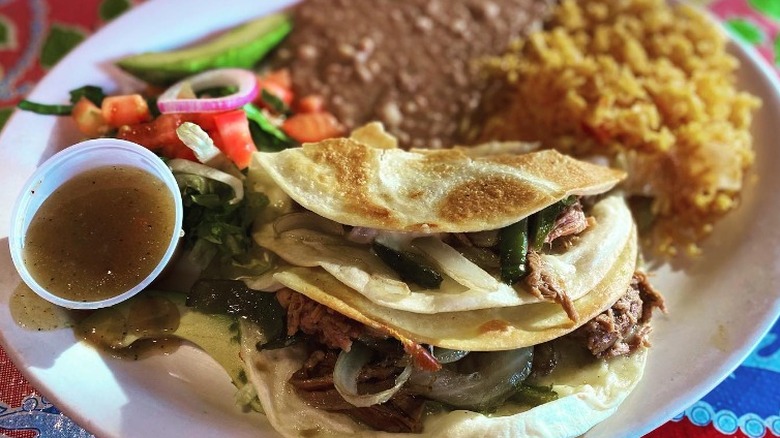 Crispy, savory, juicy tacos de birria have become a standard of late in Dallas. Originally, early Mexicans made the dish with goat meat before transitioning to beef. If you are unfamiliar, birria is meat slowly stewed with adobo (a mixture of garlic, chile, and herbs) and served inside a crispy taco dipped in fat and grilled. Each taco is served with stewed juices on the side, perfectly succulent for dipping. Birria has been a breakfast favorite in Jalisco, Mexico, since the 1950s, but the juicy tacos found their way to America originally through Tijuana before Los Angeles taco stands began dishing up the flavor-bomb in 2015 (via Eater).
