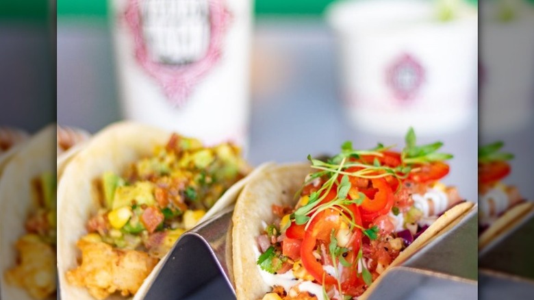 As good as the tacos are (and they are), we are thrilled that you can now have an especially incredibly item called the Backdoor Chicken any night of the week. When the original Henderson Avenue location opened, you could only find your way to savory, juicy rotisserie roasted chicken by knocking on the back door on Monday nights, per Dallas Observer. Now, every Velvet Taco presents the menu star as a $20 family meal every day. The offer includes a 48-hour brined, whole rotisserie chicken, Korean barbecue sauce, corn tortillas, roasted elotes, and fresh pico de gallo. Bonus, you can still beat the Monday blues by getting the meal for a special offer at just $10.