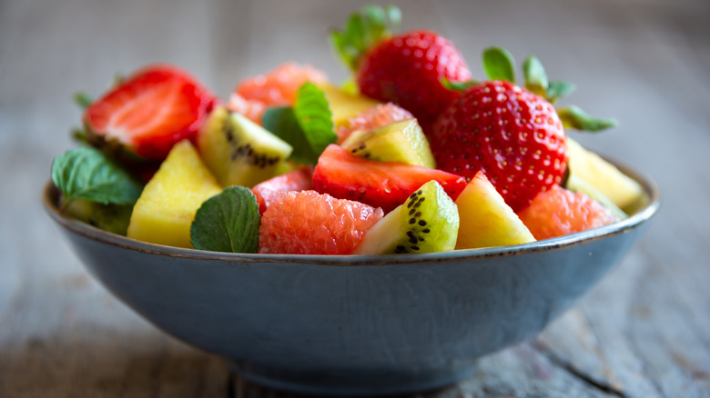 Fruit salad is a summer staple. With so many fresh fruits in season, there's a plethora of options to mix up and serve at a picnic, backyard cookout, or brunch on the patio. And there's just about as many recipe variations out there as there are fruits to choose from. It could be as simple as the classic mixture of your favorite berries or a melon and citrus blend with honey dressing (via Southern Living). Or you could mix things up by adding in cheese or even quinoa.