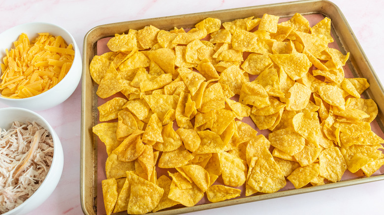 - Spread the tortilla chips on the baking sheet in an even layer.