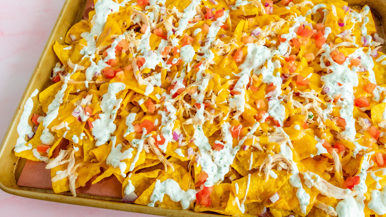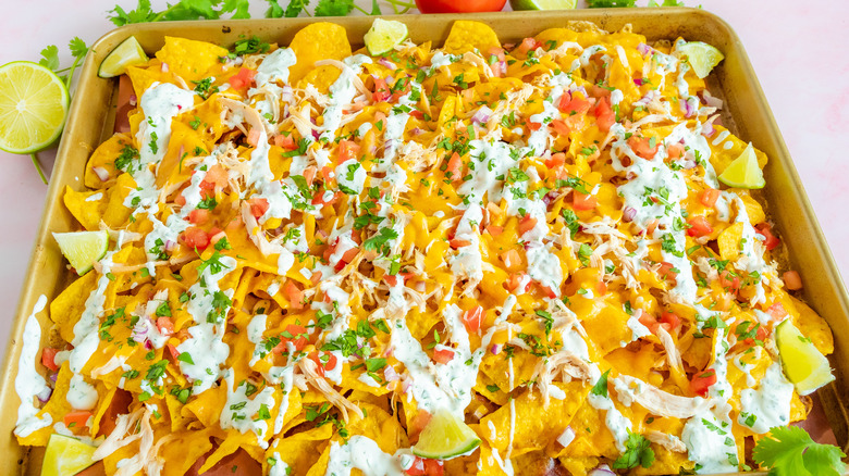 Putting together this pan of baked nachos will only take 10 minutes. Once all of the toppings are added, you'll only have to wait 5 minutes more for the cheese to melt in the oven. After 15 minutes, it'll be time to dig into gooey, melty cheese, hearty chicken, and a cilantro sour cream that completes the dish.