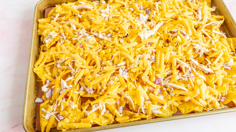 - Sprinkle the chips with shredded chicken, red onion, and cheddar cheese.
