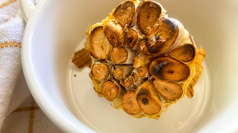 - Slice ¼ inch off the top of a garlic bulb so all cloves are exposed. Brush 1 teaspoon of olive oil over the tops and place in an oven safe dish. Cover with foil and cook for 45 minutes or until the cloves are browned.
