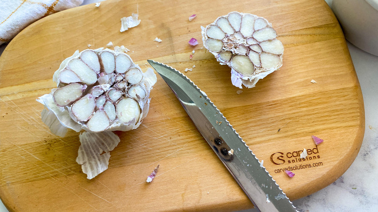 As the rice sits, you can move into the next step. By now, the garlic should be done cooking. Take it out of the oven and let it cool. Then, pop out the inside of each clove. Please note that the garlic should be soft and gooey, indicating that it's done cooking. Chop the garlic cloves and then add to the pot of rice.