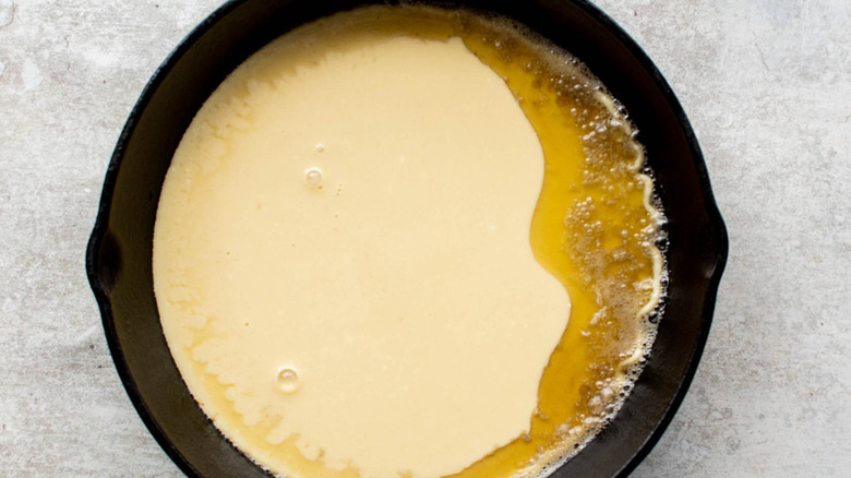 With the batter ready to go, you can carefully remove the skillet from the oven and add the butter. Because the skillet is hot, the butter should melt right away, so you can quickly follow up by pouring the batter in. The batter will begin cooking immediately, so swiftly transport the pan back into the oven, and let the Dutch baby cook — unbothered (no peeking!) — for 20 minutes.