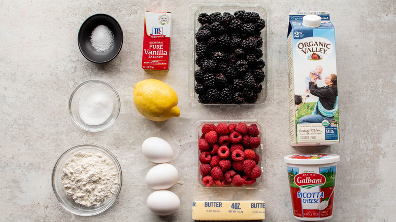 Dutch babies are incredibly versatile and can be prepared as a sweet treat or a savory dish. For this recipe, we're sticking with the former. You'll need some eggs, flour, granulated sugar, salt, vanilla extract, butter, and of course that special ingredient — ricotta cheese — which will add some extra flavor and contribute to the fluffiness. As for toppings, McGlinn suggests blackberries, raspberries, lemon zest, and powdered sugar.
