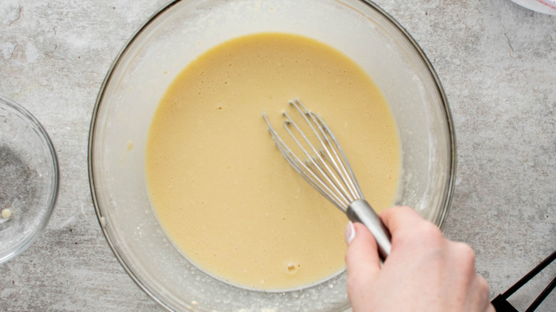 Now, it's time to focus on making the batter. Whisk the eggs together until they're bubbly, which will help lend to the fluffy nature of the baby. Then add the milk, flour, ricotta cheese, sugar, salt, and vanilla extract. Whisk everything together until there are no lumps remaining; it could take up to 5 minutes of whisking to achieve such a consistency. Alternatively, you can add all of the ingredients into a blender and blend until smooth, but with this method, you'll want to let the blended mixture sit for 10 minutes so the flour can absorb. "Since whisking takes longer, the flour has a chance to absorb the liquids while you whisk," McGlinn explains. "If blending, you want to let the batter rest to give the flour a chance to absorb the liquids.