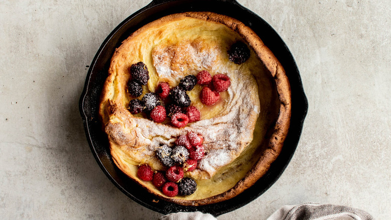 Once the Dutch baby has cooked and thoroughly puffed up in the oven, you can remove it from the heat. Top it off with some powdered sugar, lemon zest, and berries (or whatever your sweet tooth fancies), then you're ready to enjoy this wonderful pancake-esque breakfast, which McGlinn notes you could absolutely serve as dessert. If you do take that route, you may want to add even more sugar to the batter.